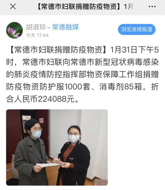 防控就是责任!市妇联兼职副主席、女企业家互助会会长、东风纺织有限公司董事长高绪秀积极响应市妇联的倡议和号召,率先示范献爱心,当她得知常德疫情严重时,远在澳大利亚的她开始积极采购医疗防护物资,并第一时间捐赠物资达5万元,女企业家商会的会员也积极响应、建言献策,联系口罩、防护服、护目镜等购买渠道,为常德疫情防控工作尽一份力量。